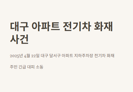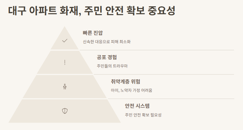 이번 대구 아파트 지하주차장 화재는 단순한 사고로 끝나지 않고, 주민 안전 확보 시스템의 필요성을 다시 상기시키는 계기가 되었습니다.