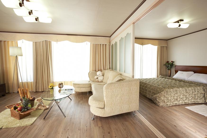 현대수리조트의 대표 객실인 23평형 객실은 더블침대와 온돌방 또는 더블침대 2개 구성을 선택할 수 있으며, 기준 인원 8명, 최대 10명까지 수용 가능합니다. 객실마다 설치된 바닥난방과 에어컨으로 사계절 내내 쾌적한 환경을 제공합니다.