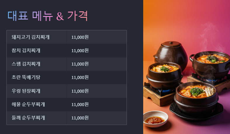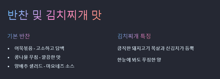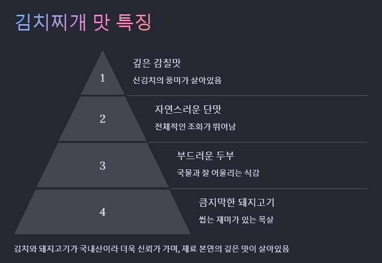 ✔️ 맛: 신김치의 감칠맛과 돼지고기의 풍미가 조화를 이루는 정통 김치찌개