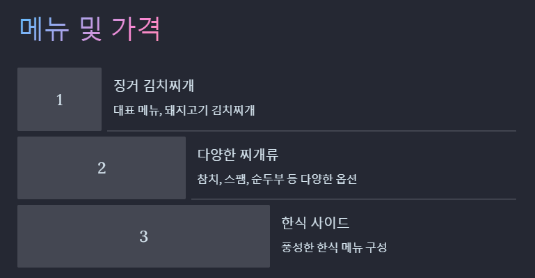 이곳의 대표 메뉴는 역시 징거 김치찌개라 불리는 돼지고기 김치찌개지만, 다양한 한식 메뉴도 함께 즐길 수 있다.