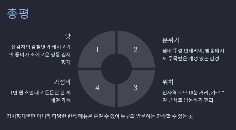 강남 신사동에서 정통 한식 징거김치찌개를 맛볼 수 있는 곳, 바로 김북순 큰남비집 신사본점이다. 이곳은 단순한 김치찌개 전문점이 아니라, 방송에서도 소개된 유명 맛집으로 징거 김치찌개라는 별명과 함께 입소문을 탄 곳이다.