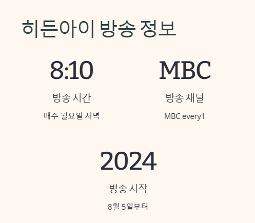 [히든아이]는 MBC every1에서 매주 월요일 저녁 8시 10분에 방송됩니다. 본방송을 놓친 시청자들을 위해 다양한 채널에서 재방송이 진행됩니다.