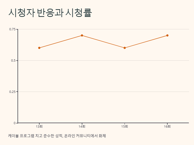 [히든아이]의 시청률은 0.6~0.8%로 케이블 프로그램 치고는 준수한 성적을 기록하고 있습니다. 16회 방송에서는 0.7%를 달성하며 꾸준한 인기를 끌고 있습니다. 특히, 출연진들의 호흡과 날카로운 분석이 시청자들에게 호평을 받고 있으며, 각종 온라인 커뮤니티에서도 화제가 되고 있습니다.