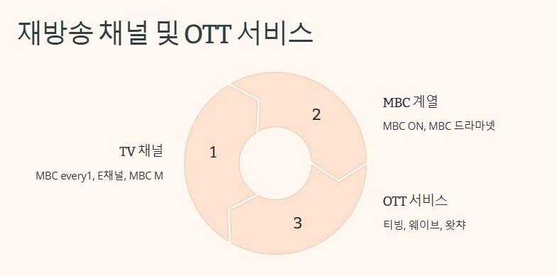 - TV 채널: MBC every1, E채널, MBC M, MBC ON, MBC 드라마넷, 채널 뷰 등에서 시청 가능
