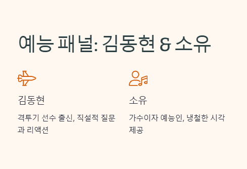 - 김동현: 격투기 선수 출신 방송인으로, 직설적인 질문과 리액션으로 방송의 활력을 더합니다.