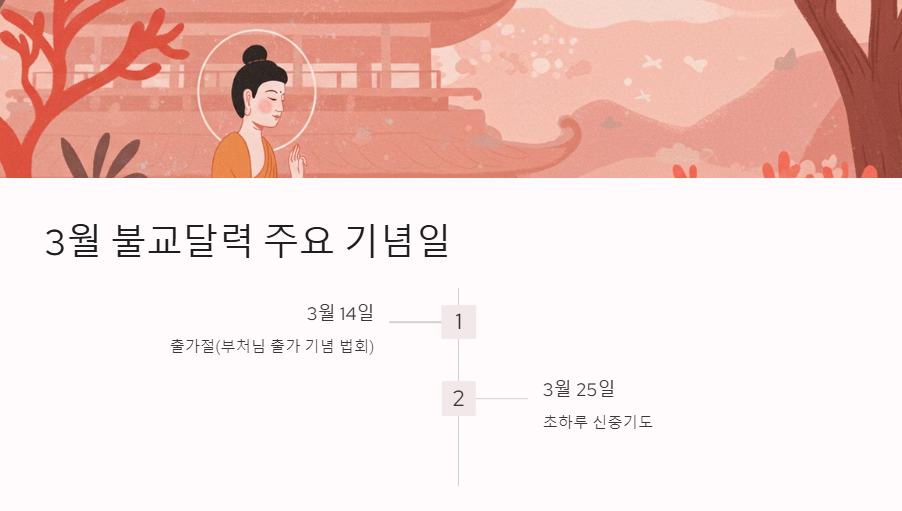 - 3월 14일(음력 2월 15일): 출가절(부처님이 왕궁을 떠나 출가한 날, 주요 법회 진행)
