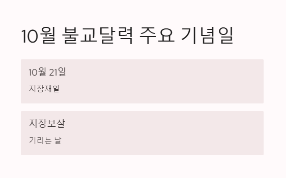 - 10월 21일(음력 10월 10일): 지장재일(지장보살을 기리는 날)
