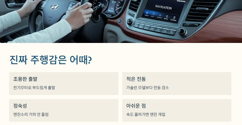 특히 전기모터로 부드럽게 출발할 때 느낌이 진짜 조용하고 부드러워서 깜짝 놀랐어.