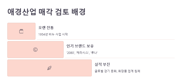 애경산업은 오랜 전통을 지닌 기업이다. 1954년 비누 사업을 시작으로, ‘2080’, ‘케라시스’, ‘루나’ 등 인기 브랜드를 보유한 애경산업은 애경그룹의 모태기업이라 할 수 있다. 그러나 최근 몇 년 간 실적 부진과 글로벌 경기 둔화, 화장품 업계의 침체가 겹치면서 매각 검토라는 극단적인 결정을 고려하게 된 것이다.