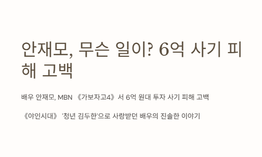 배우 안재모가 최근 MBN 예능 프로그램 《가보자고4》를 통해 6억 원대의 투자 사기 피해 사실을 고백하면서 화제가 되었습니다. 전성기 시절 드라마 《야인시대》의 ‘청년 김두한’으로 대중의 사랑을 받았던 그가 오랜만에 방송에 출연해 전한 진솔한 고백에 팬들은 놀라움을 감추지 못하고 있습니다.