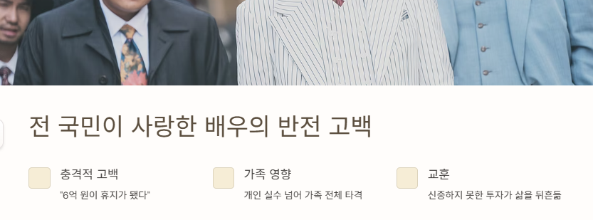 그의 고백은 단순한 연예인 소식 이상의 의미를 지니며, 투자와 신뢰의 중요성, 가족의 의미에 대해 다시금 생각하게 만듭니다.