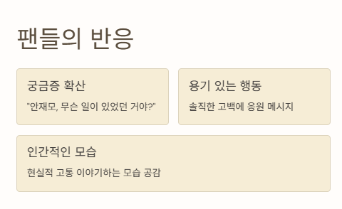 안재모의 고백에 대해 팬들은 각기 다른 반응을 보였습니다. 일부는 그가 보여준 진정성과 용기에 박수를 보냈고, 또 다른 일부는 그의 인간적인 면모를 더욱 가깝게 느꼈다고 전했습니다. 이는 단순히 연예인과 팬의 관계가 아닌, 사람과 사람 사이의 신뢰와 이해를 바탕으로 한 관계로 이어지는 중요한 순간이었습니다.