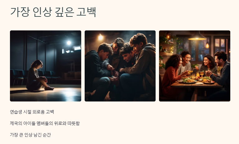 연습생 시절 외로움을 고백하며 제국의 아이들 멤버들에게 받은 위로와 따뜻함을 언급한 부분이 가장 큰 인상을 남겼습니다.