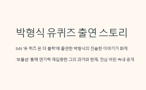 유 퀴즈 온 더 블럭 박형식 편은 단순한 출연이 아니라, 그가 살아온 지난 시간에 대한 ‘정리’와도 같았다. 연습생 시절의 고통, 팀원들과의 의리, 연기자로서의 열정까지 모두 담은 이 한 편의 방송은 한 인물이 어떻게 변화하고 성장하는지를 잘 보여준다.