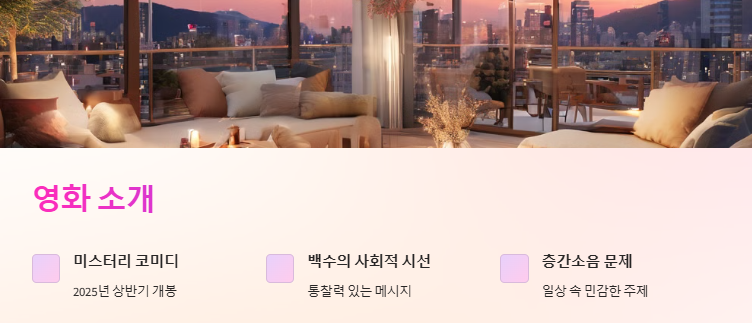 '백수아파트'는 2025년 상반기, 관객들에게 따뜻한 웃음과 현실적인 공감을 동시에 선사한 미스터리 코미디 영화다. 제목만 들으면 우스꽝스럽게 느껴질 수 있지만, 이 영화는 ‘백수’라는 존재의 사회적 시선에 대한 통찰과 함께 아파트라는 일상 공간 속 층간소음이라는 민감한 문제를 중심으로 이야기를 풀어낸다.