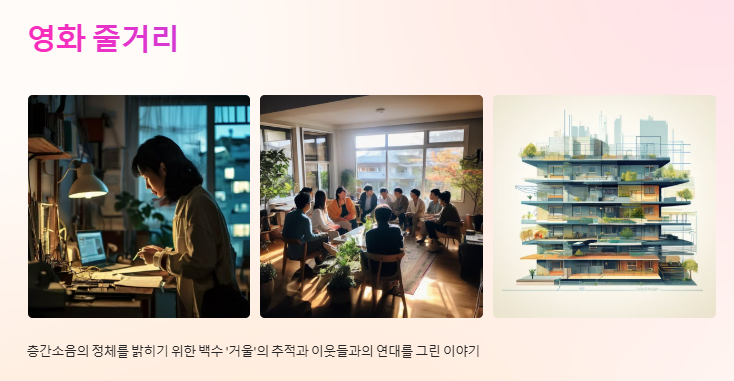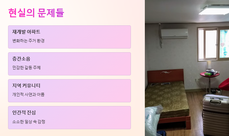 영화는 재개발을 앞둔 아파트, 층간소음, 민원, 지역 커뮤니티 등 현실에서 누구나 한 번쯤은 마주친 문제들을 드러낸다. 특히 층간소음이라는 민감한 주제를 통해, 각 캐릭터가 처한 개인적인 사연과 아픔을 그려내며 입체적인 서사를 만든다.