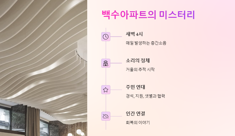 그녀가 이사 온 백세아파트는 매일 새벽 4시마다 층간소음으로 고통받는 기묘한 공간이다. 소리의 정체를 밝히기 위해, 거울은 주민 경석(고규필), 지원(김주령), 샛별(최유정) 등과 연대한다. 이 구조는 ‘백수아파트’라는 영화가 단순한 소음 탐정극이 아닌 인간 간의 연결과 회복을 담았다는 것을 보여준다.