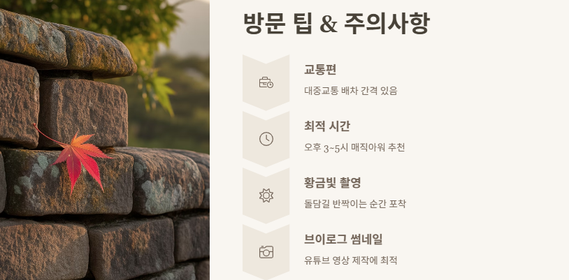 솔직히 말씀드리면, 가는 길은 조금 불편할 수도 있어요. 대중교통은 배차 간격도 좀 있고요. 하지만!! 그래도 절대 후회 안 해요. 그리고 촬영하실 분들은 꼭 오후 3~5시쯤 매직아워 시간대 맞춰 가세요.