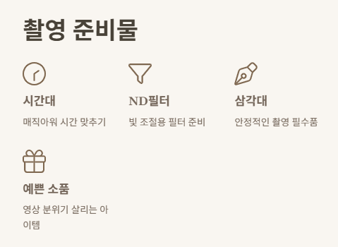 A1. 시간대(매직아워), ND필터, 삼각대, 예쁜 소품 준비 추천!