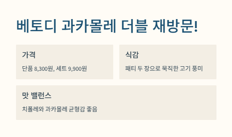 솔직히 싱글만 먹고 끝내긴 아쉬워서 바로 다음날 베토디 과카몰레 더블로 재방문했어요. 단품은 8,300원, 세트는 9,900원이었어요. 확실히 더블은 패티가 두 장이라 그런지 묵직하고 고기 풍미가 제대로 느껴졌어요!