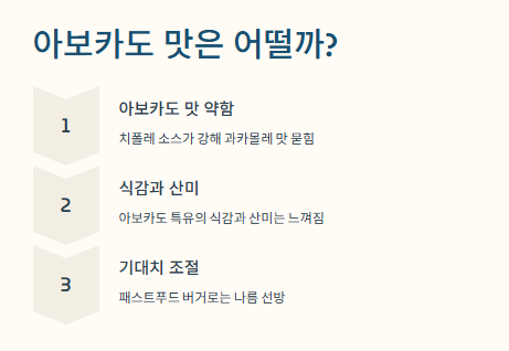 전 평소에 아보카도 엄청 좋아하거든요. 샌드위치에도 넣고, 샐러드에도 넣는 사람이라 기대치가 높았던 건 사실이에요. 근데 이건 패스트푸드 버거라는 걸 감안하면 나름 선방했다는 생각도 들었어요!