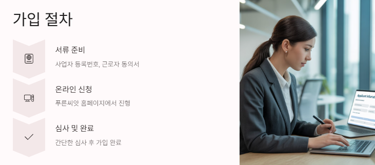푸른씨앗 홈페이지에서 모든 절차를 진행할 수 있어요. 가입을 위해 필요한 서류를 준비하고, 서류를 온라인으로 제출하면 끝! 이렇게 간편하게 가입할 수 있어 중소기업에서도 쉽게 도입할 수 있답니다. 저도 바로 가입했답니다.