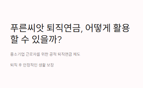 저는 퇴직 후 어떻게 살아갈지 걱정이 많았어요. 그래서 푸른씨앗 퇴직연금에 대해 알아보았는데, 중소기업에서도 퇴직금을 안전하게 쌓고, 퇴직 후 연금처럼 받을 수 있다는 사실에 안심이 되었어요. 사실, 중소기업에서는 퇴직금을 관리하는 시스템이 부족한 경우가 많기 때문에 퇴직금 지급에 문제가 생기기도 하잖아요. 푸른씨앗은 이런 위험을 줄여주는 제도랍니다.