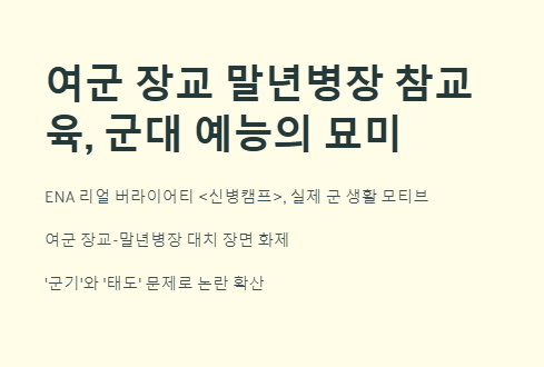ENA 리얼 버라이어티 예능 프로그램 <신병캠프>는 실제 군 생활을 모티브로 한 리얼 군대 체험 콘텐츠로 주목을 끌었다. 특히 한 회차에서 벌어진 ‘여군 장교 말년병장 참교육’ 에피소드는 시청자들의 뜨거운 반응을 불러일으켰다. 무슨 일이 있었길래?