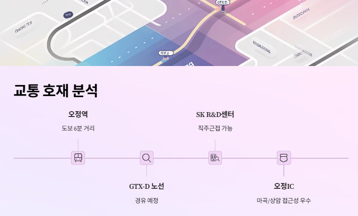 게다가 GTX-D 노선도 경유 예정이고, SK R&D센터도 예정돼 있어서 직주근접은 덤! 오정IC랑 봉오대로 타면 마곡이나 상암도 금방임.