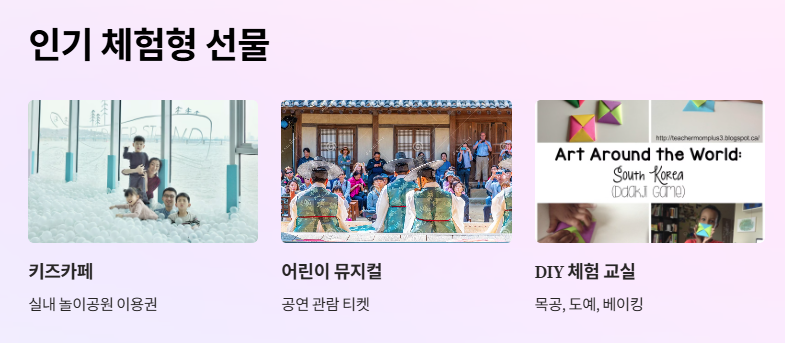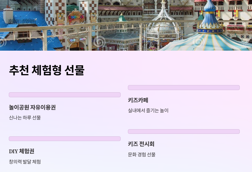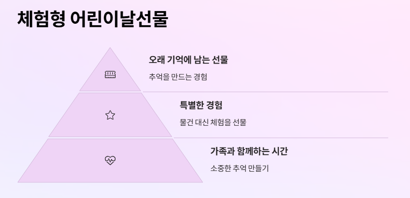 최근 ‘어린이날선물’로 떠오르고 있는 것이 바로 체험형 선물입니다. 단순한 물건이 아니라 경험을 통해 추억을 만드는 것이죠. 대표적인 예시는 다음과 같습니다:
