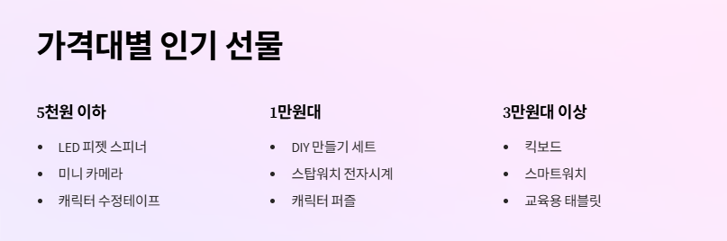 • 5천 원 이하: LED 피젯 스피너, 미니 카메라, 캐릭터 수정테이프, 미니 음악 플레이어
