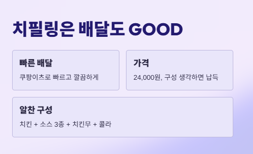 저는 쿠팡이츠로 시켰는데, 배달 시간도 빠르고 포장도 깔끔했어요. 멕시카나 치필링 가격은 24,000원으로 약간 센 편이지만, 구성 생각하면 납득돼요.