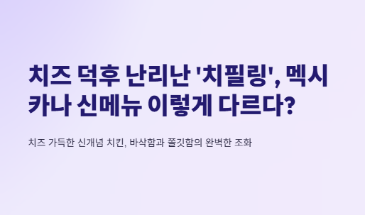 멕시카나치킨의 신메뉴 '치필링'은 치킨 안에 통모짜렐라 치즈를 넣은 신개념 메뉴로, 바삭한 식감과 고소한 치즈 맛의 조화가 특징이다.