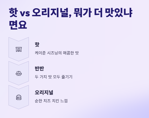 두 가지 맛 중 고민된다면 반반 메뉴로 가는 걸 추천드려요. 핫은 케이준 시즈닝이 올라간 매콤한 맛이고, 오리지널은 좀 더 순한 치즈 치킨 느낌이에요.