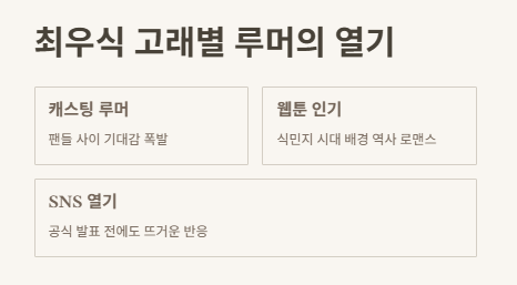 처음엔 그냥 팬픽 느낌인 줄 알았는데, SNS에서 난리난 걸 보니까 뭔가 느낌이 이상했어. 팬들 포토샵으로 가짜 포스터 만들고, ‘최우식 = 강의현’이라는 공식처럼 자연스럽게 흘러가고 있었거든. 진짜 실사화 된다면… 나 진심 준비 안 됐어. 감정 터질까 봐.
