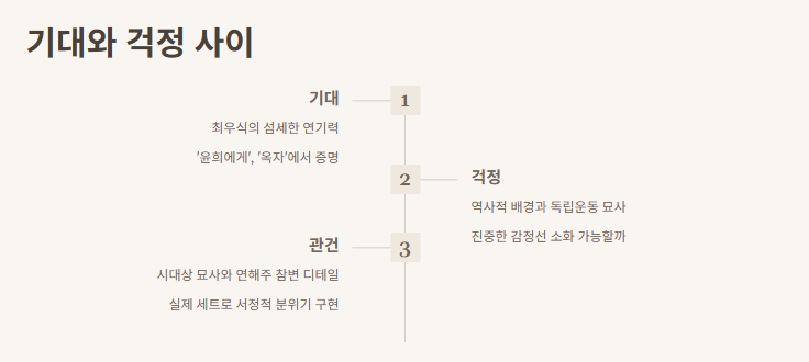 근데 사실 팬 입장에선 걱정도 돼. 고래별이 단순 로맨스가 아니라 역사적 배경과 독립운동까지 다뤄서 진중한 감정선이 많거든. 그런 면에서 최우식이 잘 소화할 수 있을까 싶다가도, '윤희에게', '옥자' 같은 영화에서 섬세한 연기 보여준 걸 생각하면 기대할 만한 것 같아.