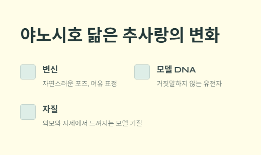 추사랑은 그저 귀여운 아이에서 멈추지 않고, 점점 성장하면서 엄마 야노 시호를 닮은 모델 DNA를 물려받았다는 평가를 받고 있습니다. 최근 화보 촬영에서는 자연스러운 포즈와 여유 있는 표정으로 전문가 못지않은 모습을 보여주었죠. 촬영장에서 "모델 DNA가 폭발했다"는 표현이 나오기도 했습니다.