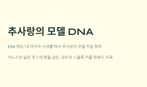 ENA 예능 ‘내 아이의 사생활’이 방영되자마자 온라인 커뮤니티가 들썩였다. 바로 추사랑이 엄마 야노시호의 ‘모델 DNA’를 고스란히 물려받은 듯한 화보 촬영 현장이 공개되었기 때문이다. 함께 출연한 유토와의 ‘스쿨룩’ 커플 화보도 화제를 모으고 있으며, 촬영 후 감정이 북받친 추사랑의 눈물까지 이어지며 많은 이들의 관심을 모았다.