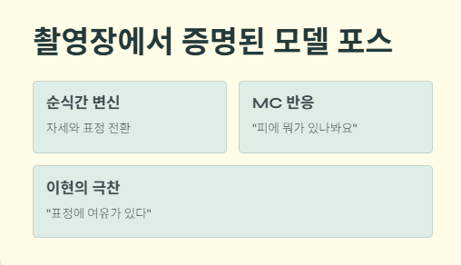 한 스튜디오 MC는 “피에 뭐가 있나봐요, 확실히 모델 포스가 있어요”라고 말했고, 옆에서 지켜보던 이현이 역시 “표정에 여유가 있다”고 극찬했다.