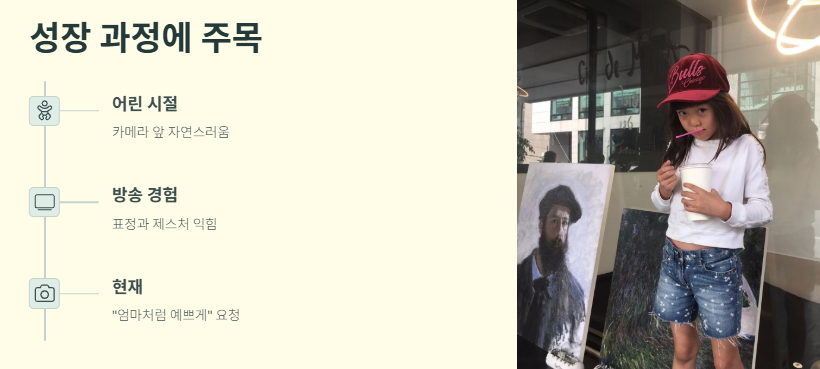 사랑이는 방송을 통해 카메라 앞에서 자연스럽게 행동하고, 표정과 제스처를 익히며 점점 더 뛰어난 모델로서의 자질을 드러내고 있어요.