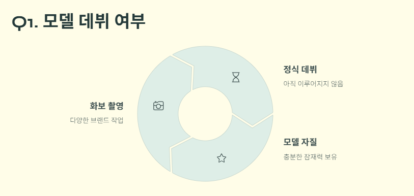 현재로서는 정식 모델 데뷔는 하지 않았지만, 여러 화보 촬영과 방송을 통해 모델 자질을 충분히 보여주고 있습니다. 전문가들은 "현재의 성장세라면, 10대 후반에는 패션계에서 확실한 주목을 받을 수 있다"는 전망을 내놓고 있습니다.