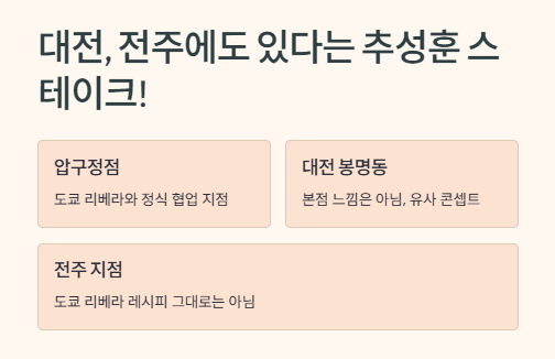 ‘대전 추성훈 스테이크’랑 ‘전주 추성훈 스테이크’도 있다길래 검색해봤는데요, 본점 느낌은 아니었어요. 압구정 마초스테이크만 정식 협업이라고 하더라구요. 대전 봉명동, 전주 지점도 괜찮다고는 하지만, 도쿄 리베라 레시피 그대로는 아니라고 해서 패스했어요.