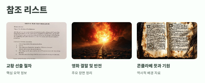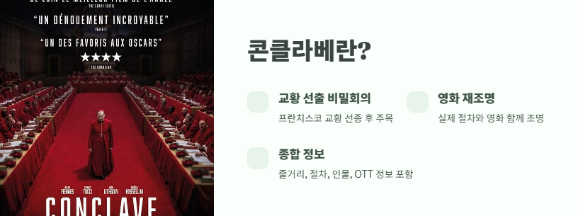 '콘클라베'는 교황 선출을 위한 비밀회의로, 최근 프란치스코 교황의 선종 이후 실제 콘클라베 절차와 더불어 영화 <콘클라베>까지 재조명받고 있습니다. 이 글에서는 영화의 줄거리, 실제 절차, 주요 인물, 후기, OTT 정보까지 종합 정리합니다.