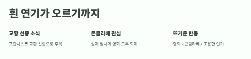 개인적으로 가장 흥미로웠던 건, 흰 연기와 검은 연기의 상징성이었습니다. 영화 속에서도 실제 역사에서도, 굴뚝에서 피어나는 연기의 색깔이 전 세계에 교황 선출의 성공 여부를 알리는 장치라는 점이 인상 깊었습니다.