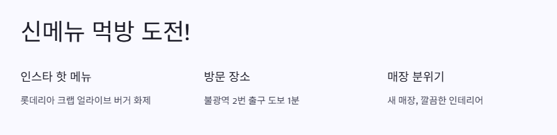 며칠 전에 진짜 인스타에서 핫하다고 소문난 ‘롯데리아 크랩 얼라이브 버거’를 친구랑 같이 먹어봤어요! 제가 다녀온 곳은 불광역 2번 출구에서 도보 1분 거리인 롯데리아 불광역점인데요, 위치도 좋고 새 매장이라 그런지 분위기도 너무 깔끔해서 기분이 진짜 좋았어요.