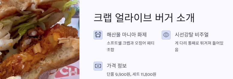 2025년 5월 출시된 롯데리아의 '크랩 얼라이브 버거'가 해산물 마니아들 사이에서 화제예요. 소프트쉘 크랩과 오징어 패티가 만나 바삭함과 풍미를 동시에 잡은 이 버거, 직접 먹어본 생생 후기를 알려드릴게요.