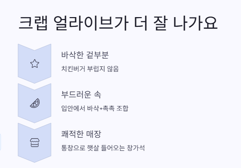 그리고 이 버거의 진짜 매력은 먹는 재미! 반으로 자르면 오징어 패티랑 크랩 튀김이 층층이 딱! 입 안 가득 바다 풍미가 퍼지는데, 감탄하면서 먹었어요. 그리고 친구는 ‘오징어 얼라이브 버거’ 먹었는데요, 그것도 괜찮았지만 결론은 “크랩이 진리”라는 걸로ㅋㅋ