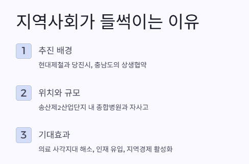 이번에 당진시랑 현대제철, 그리고 충남도가 MOU(상생협약)를 맺었다고 하더라고요. 당진 종합병원·자사고 추진이 드디어 현실화된 거라서 진짜 반가운 소식 아닌가요?