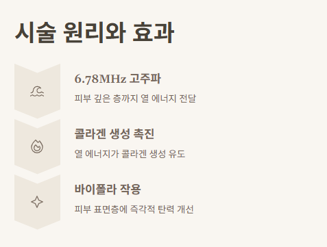 덴서티는 6.78MHz 고주파를 사용하여 피부 속 깊은 층까지 열 에너지를 전달하고, 이 에너지가 콜라겐 생성을 촉진시키며, 탄력 있는 피부로 개선됩니다. 이 과정에서 모노폴라(단극성) 고주파와 바이폴라(양극성) 고주파가 함께 작용하는데, 바이폴라는 피부 표면 가까운 층에 작용하여 즉각적인 탄력 개선 효과를 제공합니다.