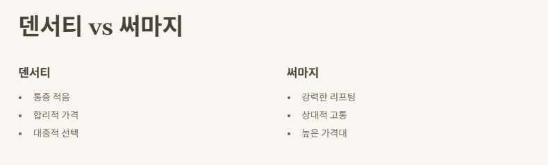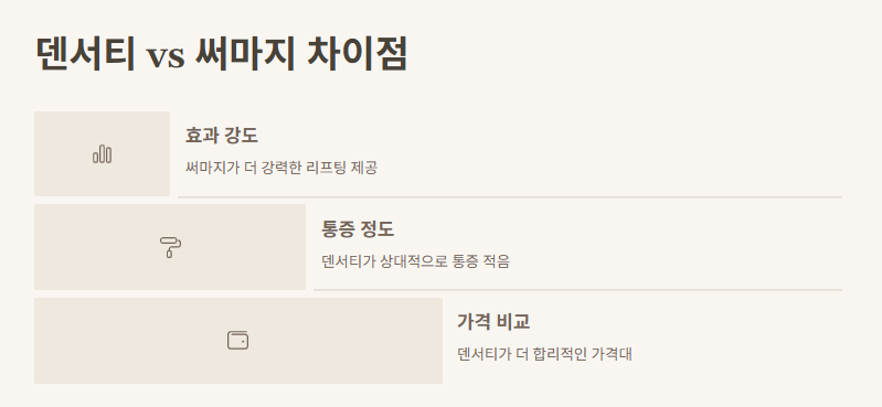 덴서티는 써마지와 비슷한 고주파 리프팅 기기지만, 통증의 강도와 가격 면에서 차이를 보입니다. 덴서티는 통증이 적고 가격이 합리적이어서 더 많은 사람들이 선택하고 있습니다. 반면 써마지는 더 강력한 리프팅 효과를 제공하지만 통증이 상대적으로 강합니다. 따라서 피부 상태와 원하는 효과에 맞춰 선택하면 좋습니다.
